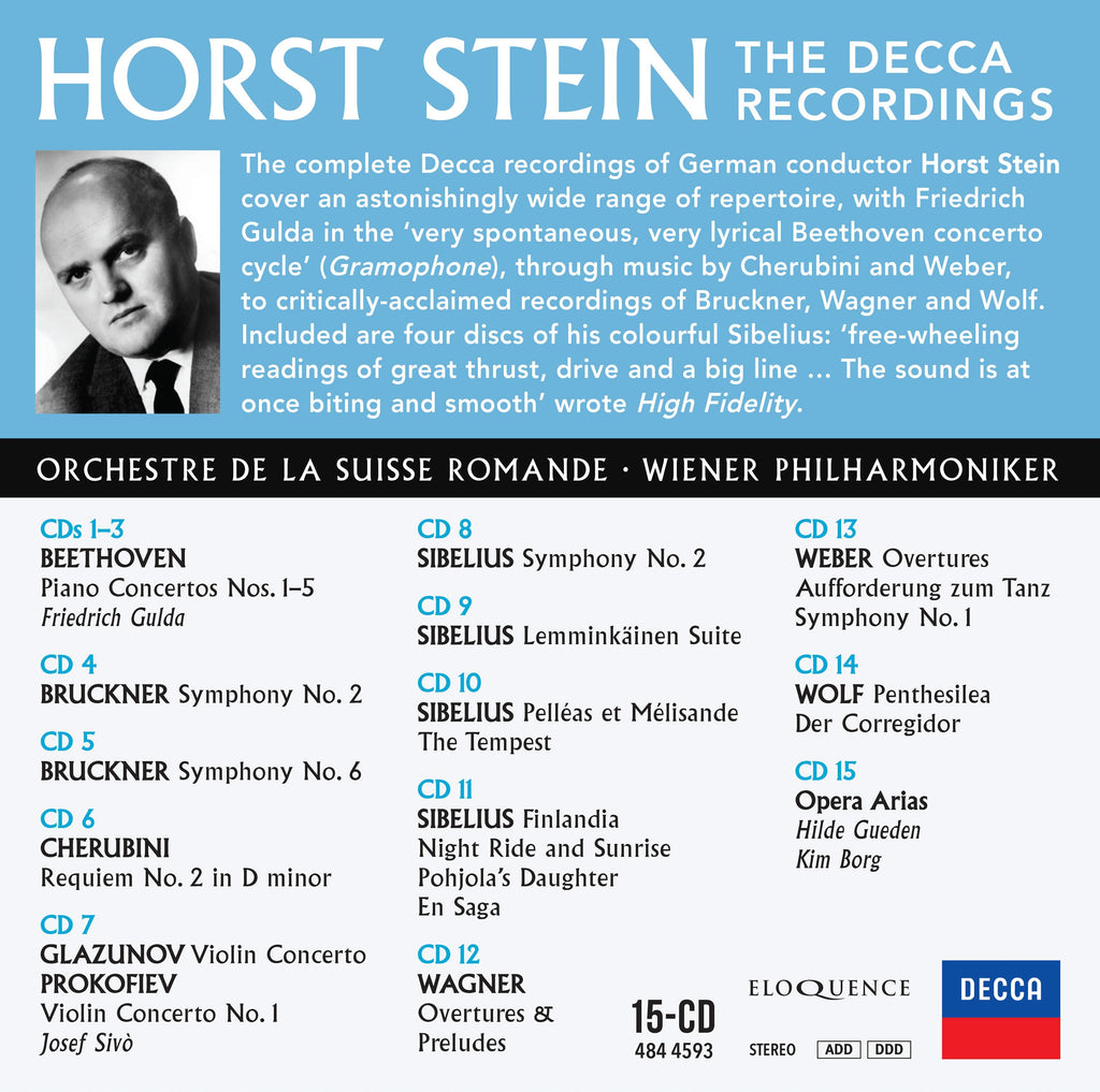 The complete Decca recordings of a Horst Stein, directed with the unfussy authority of his many appearances at Bayreuth and the Vienna State Opera. The recordings in this set, cover an astonishingly broad range of repertoire. Beethoven concertos (with Friedrich Gulda, once a staple of the Decca catalogue), Cherubini, Prokofiev, Bruckner, Sibelius: all writing in completely contrasting idioms, and yet all brought stylishly to life here under the baton of Horst Stein.