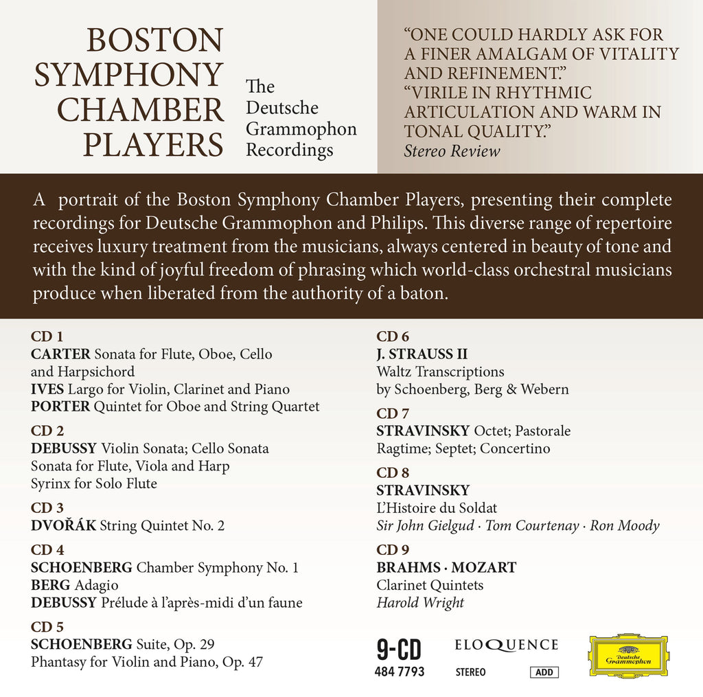 A portrait of the Boston Symphony Chamber Players through the 1970s, through their complete recordings for Deutsche Grammophon and Philips. This diverse range of repertoire receives luxury treatment from the musicians, always centered in beauty of tone and with the kind of joyful freedom of phrasing which world-class orchestral musicians produce when liberated from the authority of a baton. The Boston Symphony Chamber Players were created in 1964, to play at the Tanglewood Festival before the ‘main event’ of the Boston Symphony’s concerts. Before long, the BSCP became the main event themselves, with a programme of concerts throughout the year, and a busy recording schedule. When the Boston Symphony Orchestra began to record with DG in 1970, so did the Chamber Players.
